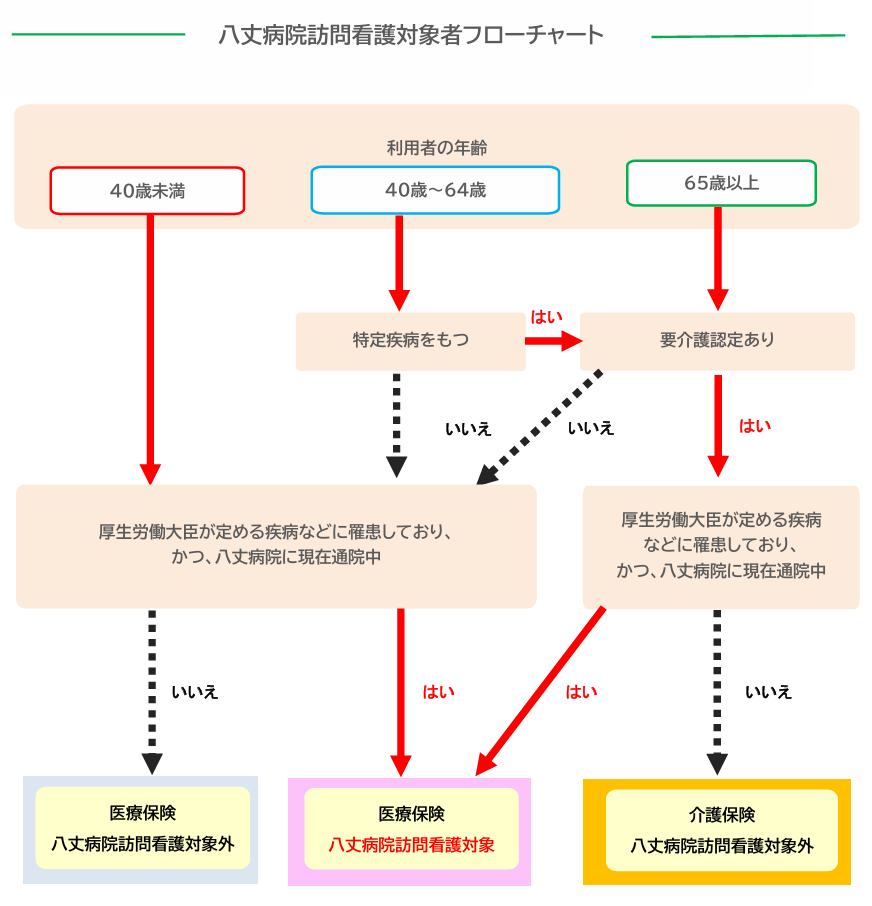 当院では、職員体制や受入可能人数などから、訪問看護において医療保険が適用される方の内、以下のいずれかの要件に該当する方を対象とし、訪問看護を開始します。